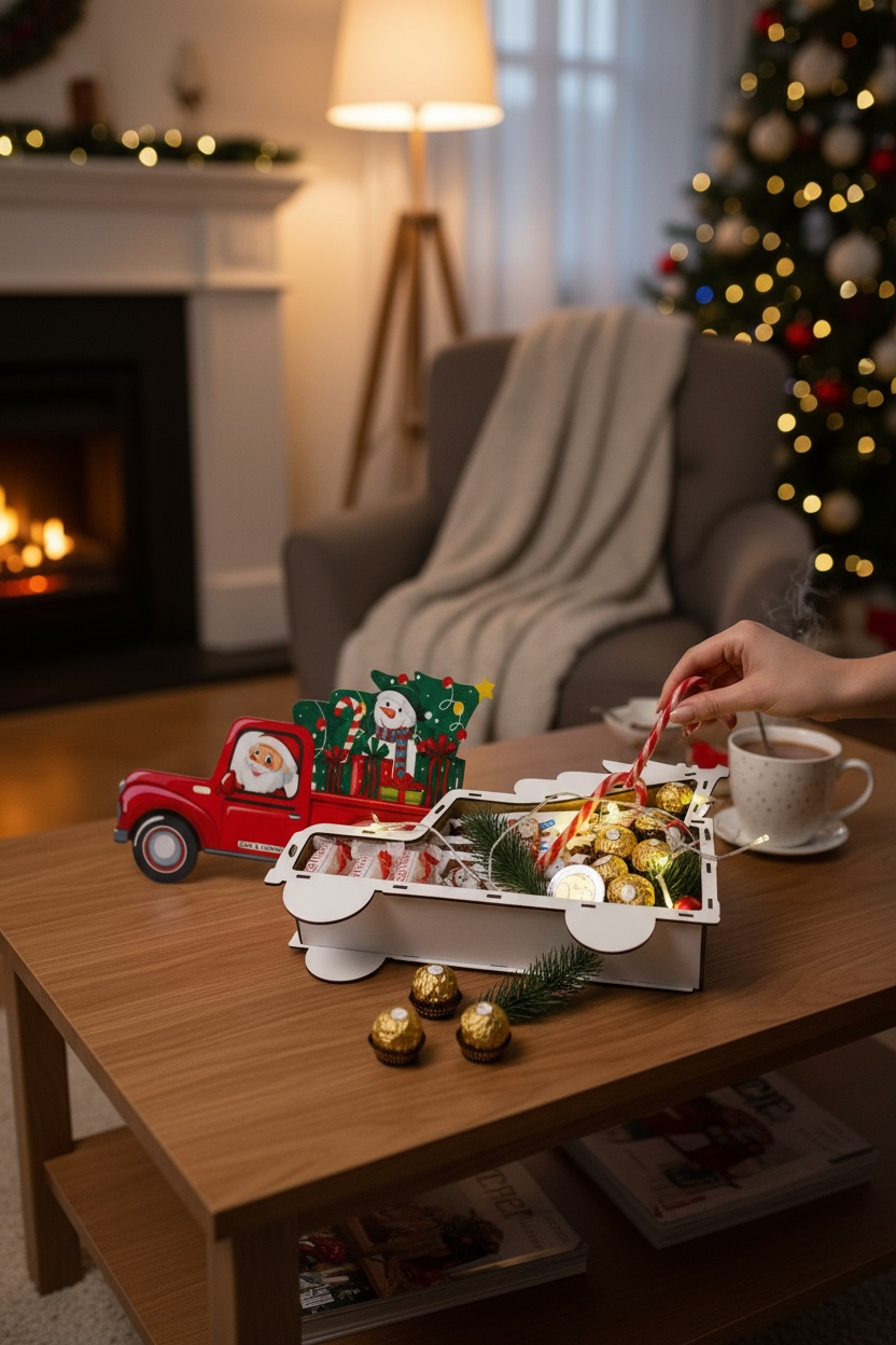 🎅 Le camion, orné d’un Père Noël souriant et d’un bonhomme de neige, est parfait comme cadeau original, décoration de table ou surprise gourmande pour petits et grands.