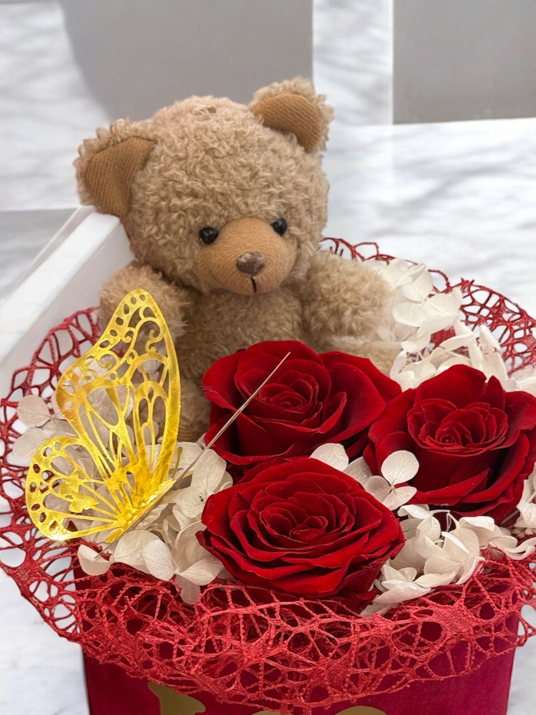rose éternelle, boîte cadeau romantique, ours en peluche, idée cadeau femme, roses stabilisées, décoration florale amour, coffret LOVE